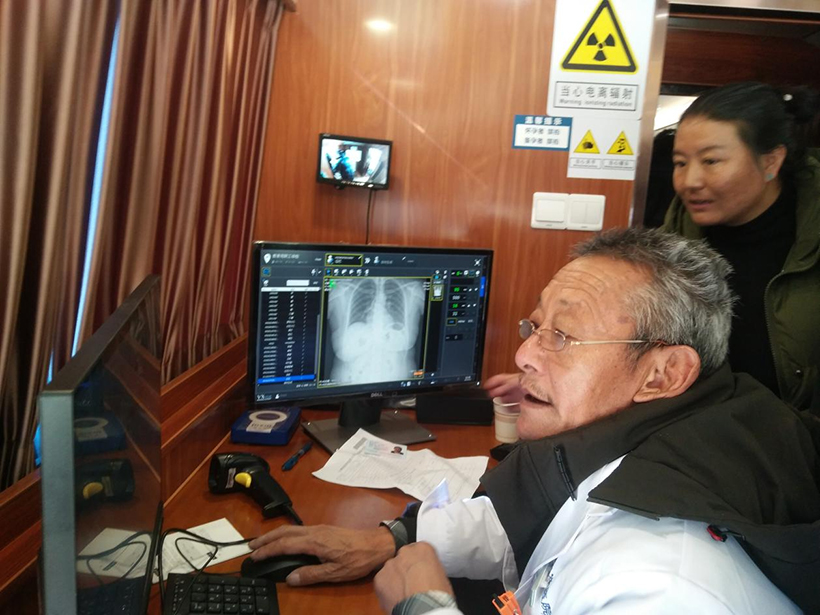 圖為我院放射科主任次仁加錯主任為患者進行胸片拍攝準備工作。